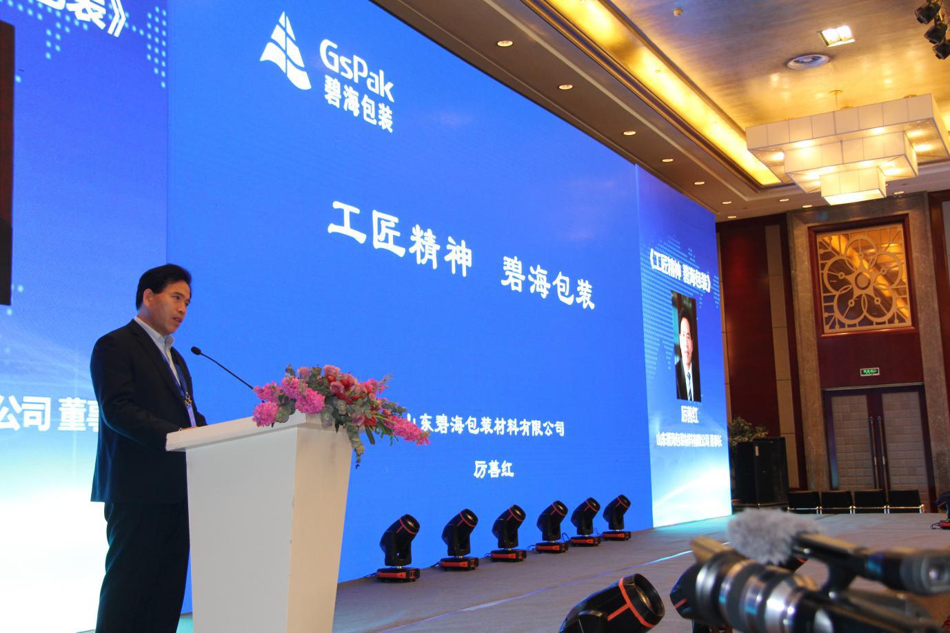 山東碧海包裝材料有限公司董事長厲善紅在第七屆亞洲食品裝備論壇暨中國食品和包裝機(jī)械工業(yè)協(xié)會(huì)第二十七屆年會(huì)上做題為《工匠精神 碧海包裝》的發(fā)言