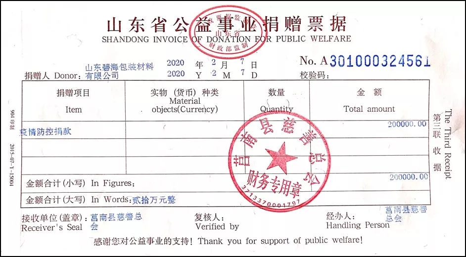 近來,新型冠狀病毒引起的肺炎疫情形勢嚴峻,時刻牽動著全國人民的心。共抗疫情,責任在肩,山東碧海包裝材料有限公司為了積極助力疫情防控,于2020年2月7日捐款人民幣20萬元,馳援抗擊疫情,所捐款項將用于抗擊新型冠狀病毒肺炎疫情。